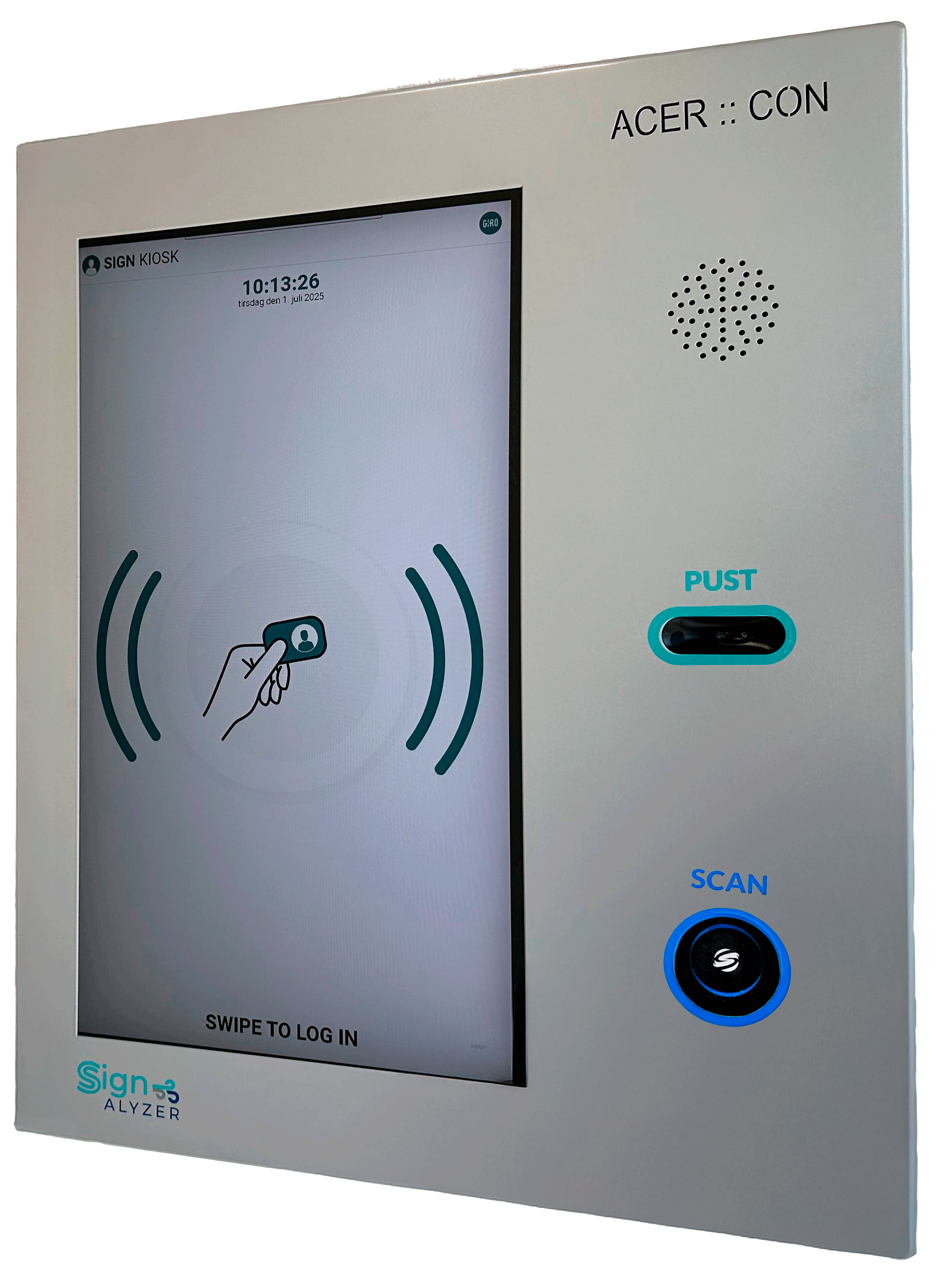 Sign Alyzeren leveres med touchskærm, alkoholtester, RFID-læser og betjeningssoftware.